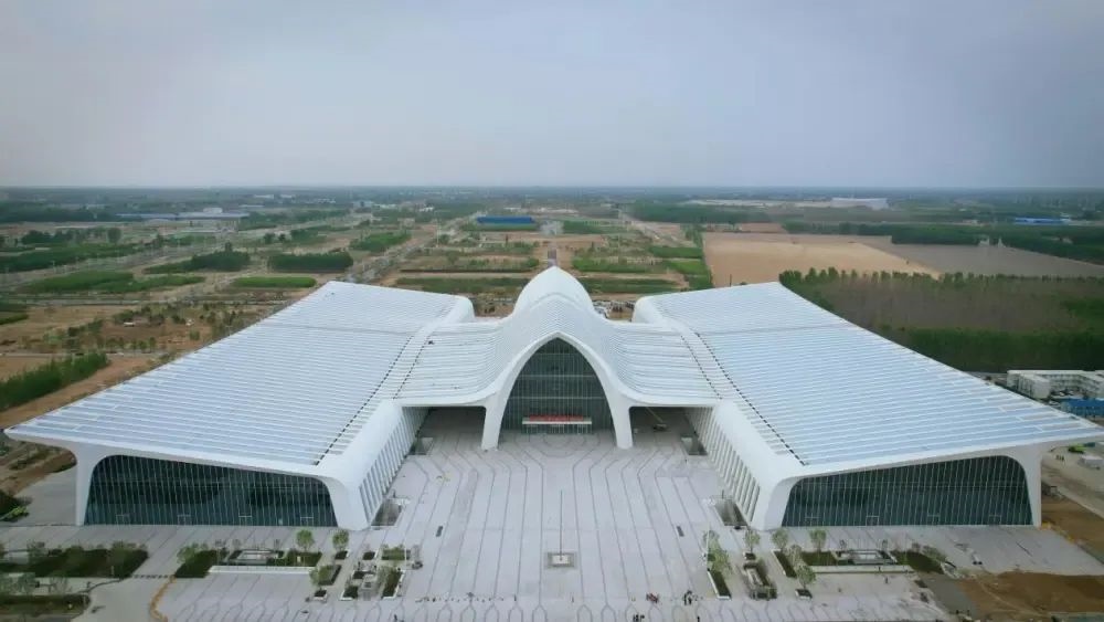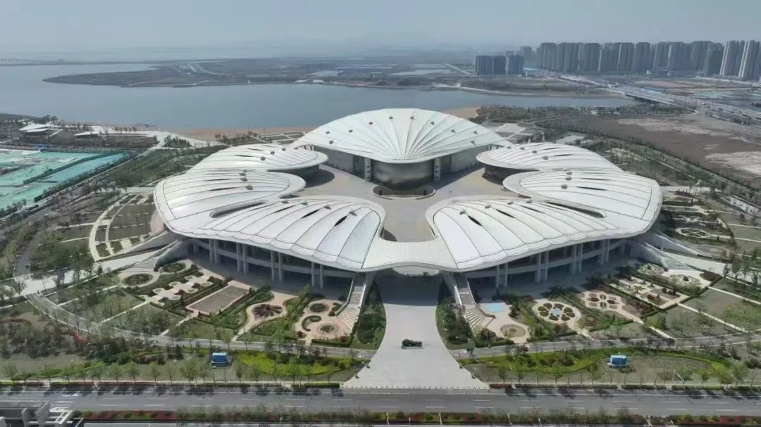 Дар минтақаи намоиши Qingdao SCO, Маркази Бахши СҲШ ҷойгиршуда дар кӯли шири Лирс таассуроти бардавом дорад. Аз боло дида баромада шуд, аз боло дида мешавад, ки тарҳи "ваҳдат" -и он шаҳодат медиҳад, ки ҳафт бомбаҳои сафедпӯстон ҳафтбударо ба монанди якунимаи сафед доғдор мекунанд. Онҳо мавҷҳои ритминро эҷод мекунанд, ки мавҷҳои норозигии шевусро ба сӯи осмон мебаранд.