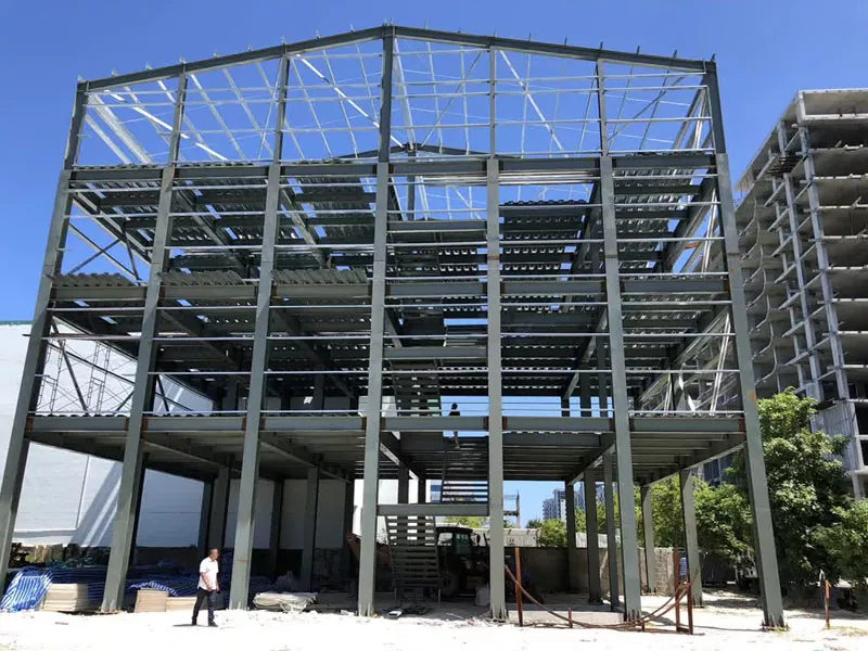 5. Бомпӯшӣ ва рӯйпӯши берунӣ Пас аз ба итмом расидани чаҳорчӯбаи пӯлод, системаи бомпӯшӣ одатан бо истифода аз панелҳои металлии изолятсияшуда ё маводи мембранаи якқабата насб карда мешавад. Деворҳои берунӣ, агар ба тарҳ дохил карда шуда бошанд, инчунин бо истифода аз панелҳои металлӣ, хишт ё дигар масолеҳи рӯйпӯш насб карда мешаванд.